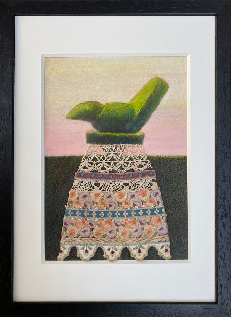 Birds in Skirts is a unique collection inspired by the pair of topiary birds at Hidcote and created especially for my exhibition Inspired to Stitch. These are customised one-off *gliclee prints, individually hand stitched with treasured vintage fabrics from my own studio