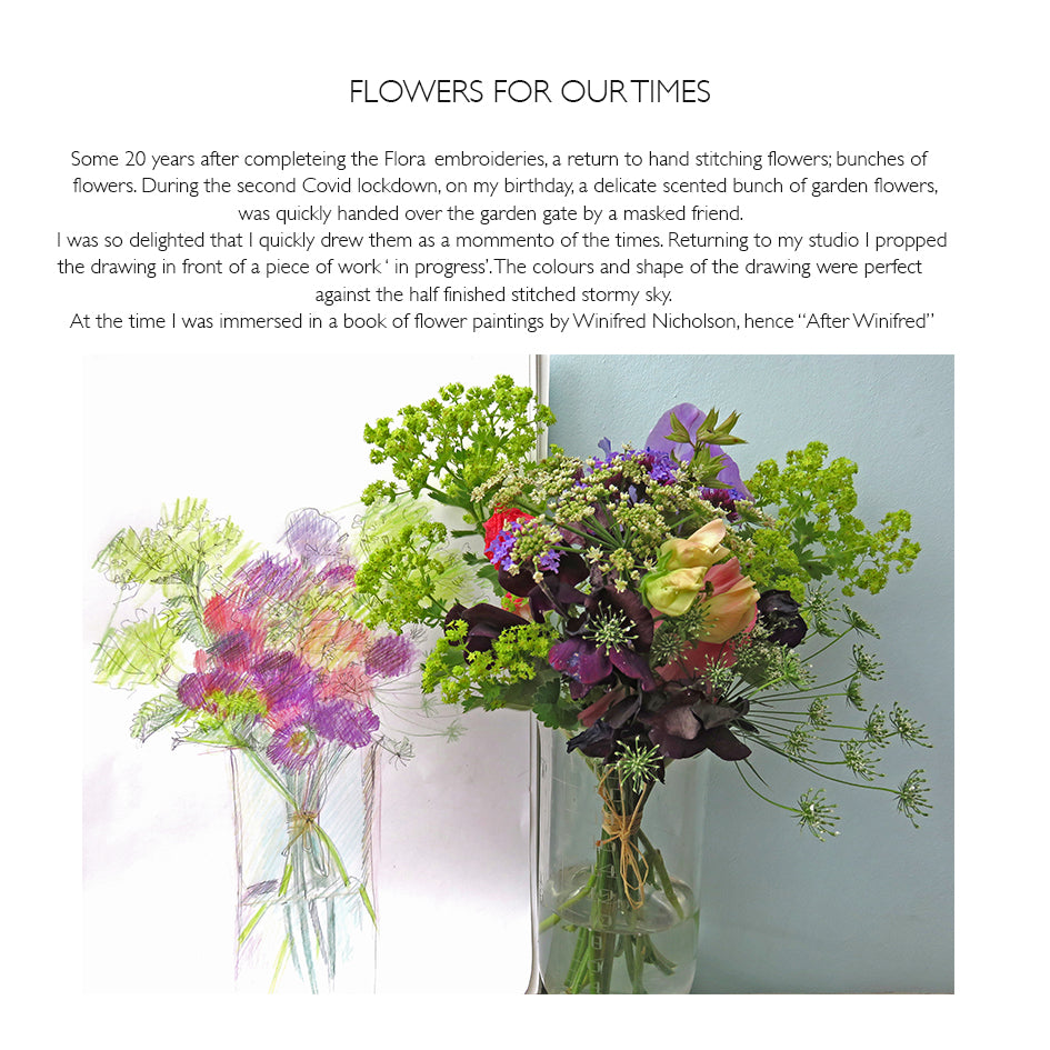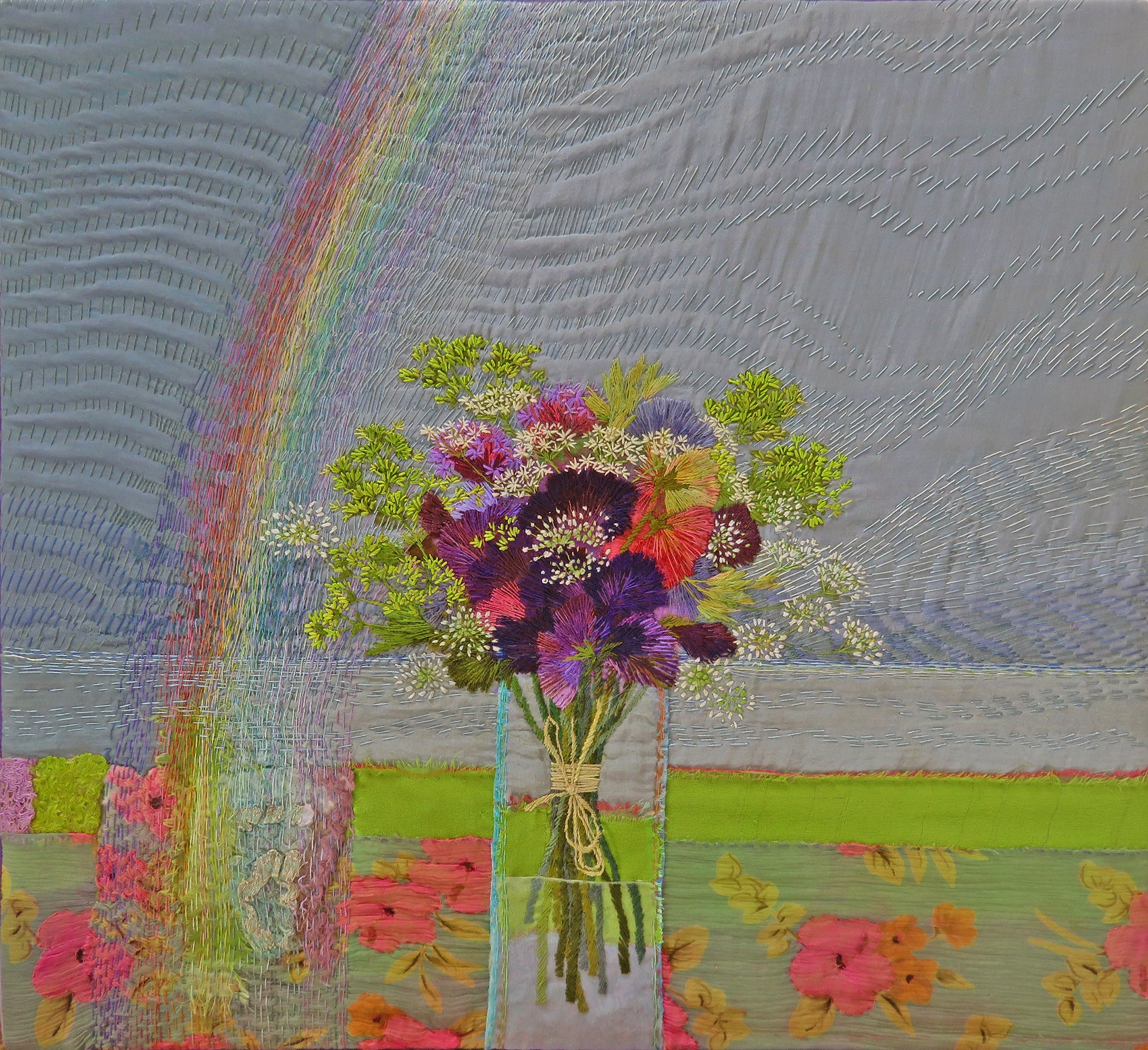 This giclee* print has been developed from a hand stitched silk embroidery that depicts a view of a rainbow over the Bristol Channel in a summer rain storm. The flowers were a birthday gift and I added them to the almost finished stitched sky and sea scape as the colours were perfect.