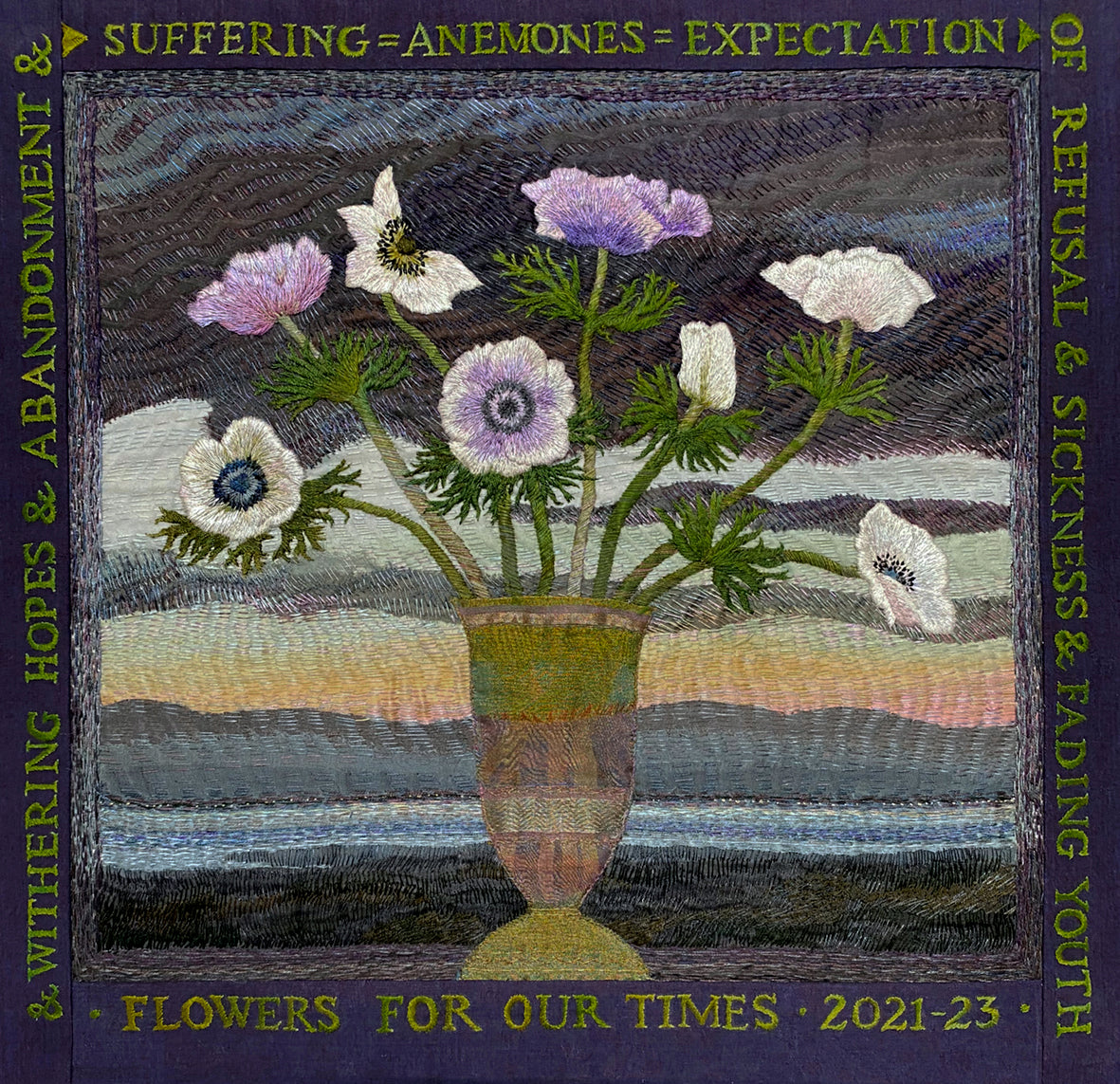A*giclee print of a hand-stitched silk embroidery of one of my very favourite flowers, early spring Anemones, portrayed against a Kantha stitched winter sky seen over the Welsh hills beyond the Bristol channel. These flowers have been chosen for their specific meanings that can be found in many books of ‘Florigraphy ‘ or the ‘Language of Flowers’.