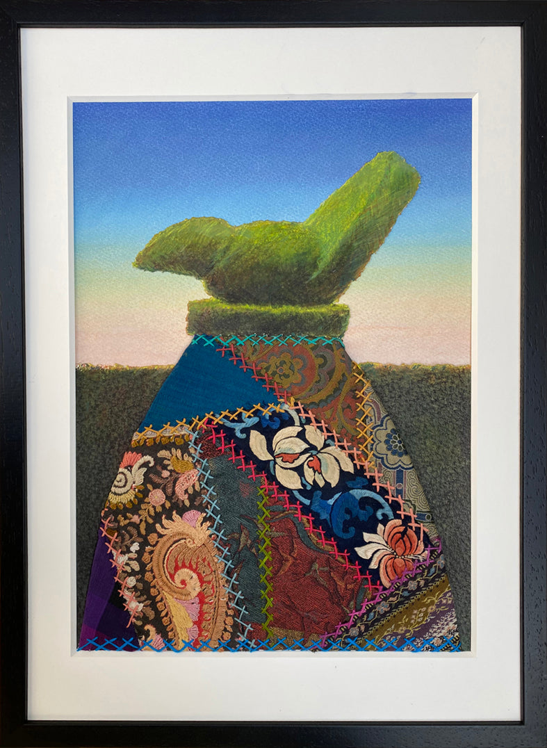 Birds in Skirts is a unique collection inspired by the pair of topiary birds at Hidcote and created especially for my exhibition Inspired to Stitch. These are customised one-off *gliclee prints, individually hand stitched with treasured vintage fabrics from my own studio