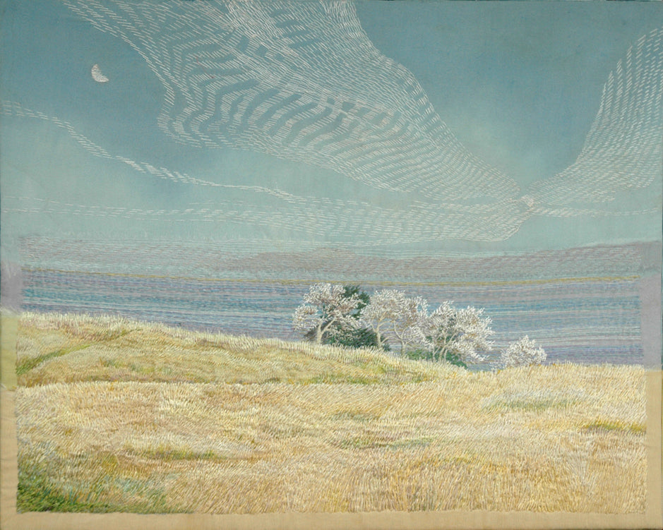 This *gliclee print is from a hand stitched silk embroidered 'kantha' sky. The view is a memory of very early morning dogwalks taken in the summer of the covid pandemic lockdown. The angel is " the angel of creativity" referenced in the book 'The Salt Path''